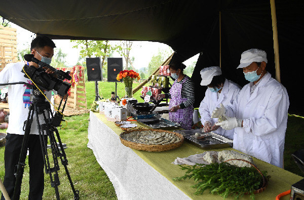 圖為近日安徽省肥西縣柿樹(shù)崗鄉(xiāng)村民通過(guò)“云上”直播制作當(dāng)?shù)靥厣朗场P氯A社記者 劉軍喜 攝