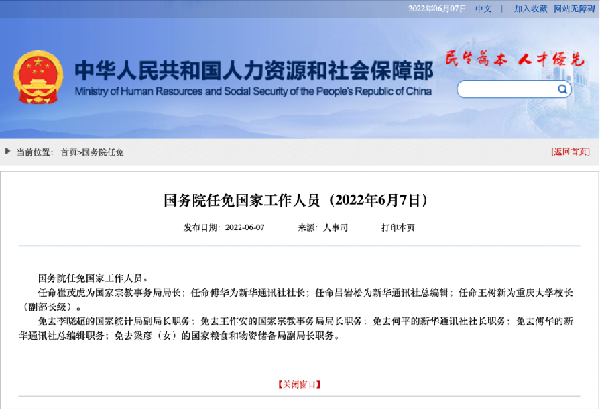 據(jù)人社部官網(wǎng)7日消息,國務(wù)院任免國家工作人員: