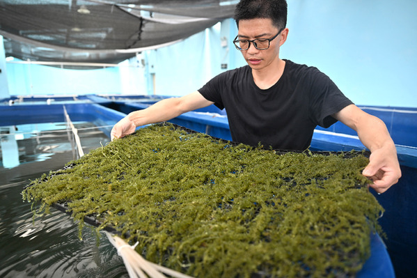 5月31日,工作人員在文昌馮家灣現(xiàn)代化漁業(yè)產(chǎn)業(yè)園養(yǎng)殖示范廠房里查看海葡萄生長(zhǎng)情況。新華社記者 郭程 攝