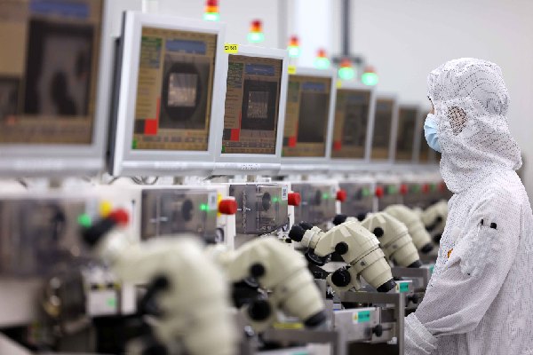在安徽省合肥經(jīng)濟技術(shù)開發(fā)區(qū)的合肥通富微電子有限公司,員工在鍵合生產(chǎn)線上作業(yè)。