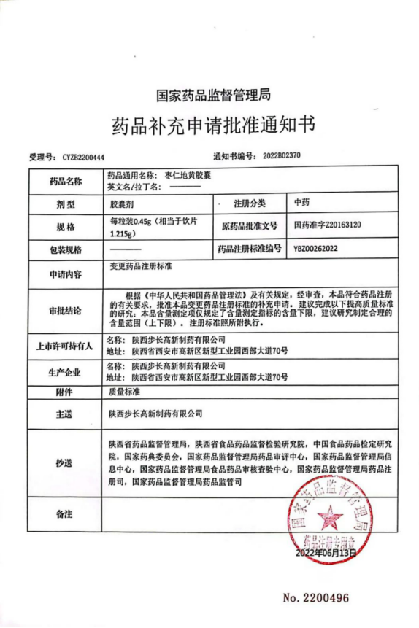 公司于2021年確定棗仁地黃膠囊黃芩苷質(zhì)量標(biāo)準(zhǔn)修訂研究,擬定質(zhì)量標(biāo)準(zhǔn)通過(guò)了陜西省食品藥品監(jiān)督檢驗(yàn)研究院技術(shù)復(fù)核,于2022年04月向國(guó)家局提交變更注冊(cè)標(biāo)準(zhǔn)的申請(qǐng),近日已取得國(guó)家藥品監(jiān)督管理局藥品補(bǔ)充申請(qǐng)批準(zhǔn)通知書。