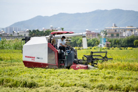 7月4日,在三亞市崖州區(qū)(壩頭)南繁公共試驗(yàn)基地,農(nóng)機(jī)手在收割水稻。