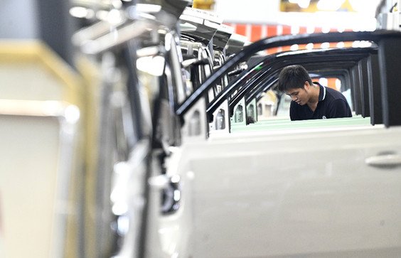 7月6日,在廣西柳州汽車城一家汽車企業(yè),工人在新能源汽車生產(chǎn)線上忙碌。