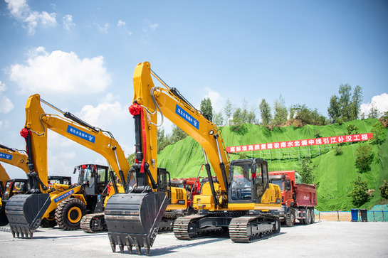 7月7日在引江補(bǔ)漢工程開工現(xiàn)場拍攝的施工機(jī)械。