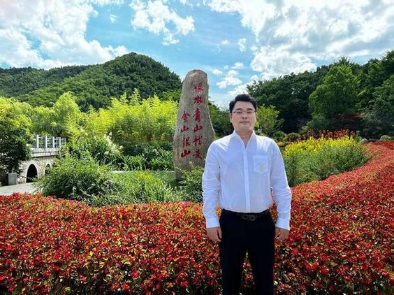 蟹狀元董事長高超與“綠水青山就是金山銀山”石碑合影