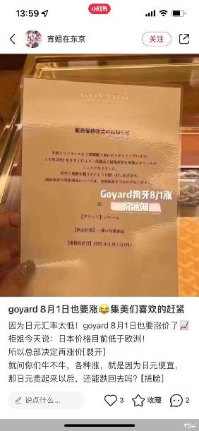 同時,由于日元貶值,奢侈品牌也在調(diào)高商品在日本的售價,漲價前,品牌也將迎來銷售熱潮。據(jù)一位小紅書博主發(fā)布內(nèi)容,goyard在日本將于8月1日漲價,當前goyard產(chǎn)品在日本的售價低于同款在歐洲的售價。