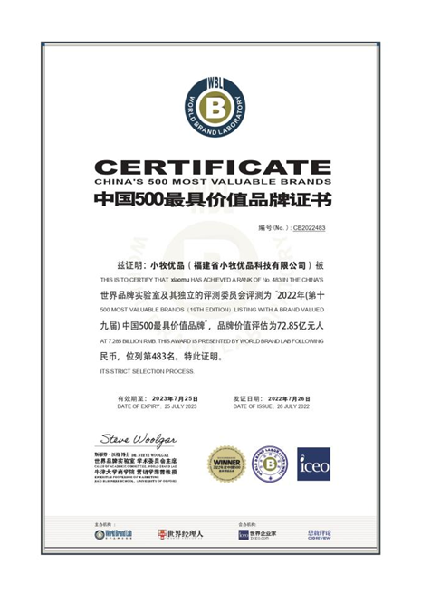 7月26日,由世界品牌實驗室(World Brand Lab)主辦的(第十九屆)“世界品牌大會”在北京舉辦,重磅發(fā)布2022年《中國500最具價值品牌》榜單,小牧優(yōu)品以72.85億的品牌價值榮耀上榜,再展風采。