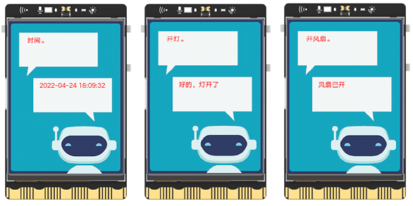 具體功能和操作如下,首先,將LED燈、風(fēng)扇外接到行空版上,之后給行空板配置網(wǎng)絡(luò),接著編寫并運(yùn)行程序,在行空版屏幕上顯示背景圖和初始信息后,按下板載按鍵錄制語(yǔ)音,等待行空板依據(jù)程序自動(dòng)將語(yǔ)音上傳至百度語(yǔ)音平臺(tái)并返回得到語(yǔ)音對(duì)應(yīng)的文字內(nèi)容,隨后對(duì)文字內(nèi)容進(jìn)行判別,當(dāng)其中有“時(shí)間”兩個(gè)字時(shí),自動(dòng)檢測(cè)系統(tǒng)的時(shí)間并更新顯示在行空板的屏幕上,而當(dāng)文字內(nèi)容中有“開燈”、“關(guān)燈”、“開風(fēng)扇”、“關(guān)風(fēng)扇”、“開鬧鐘”、“關(guān)鬧鐘”等信息時(shí),行空板控制LED等、風(fēng)扇、板載蜂鳴器執(zhí)行相應(yīng)的操作。