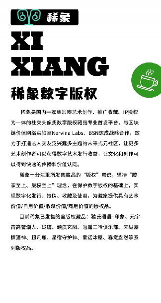 稀象一直相信以政策為主導(dǎo)的版權(quán)IP交易市場,才是數(shù)藏流轉(zhuǎn)市場的最后歸宿。并且始終堅定如一地相信,好的版權(quán)IP一定是能夠連續(xù)產(chǎn)出版權(quán)價值,以及成為具有真正收藏意義的稀缺版權(quán)作品。