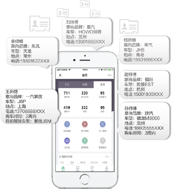 (圖為滿幫集團面向經(jīng)銷商推出的線索管理工具“滿車寶”)