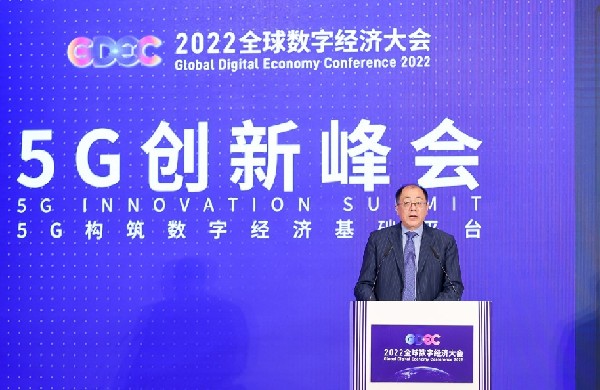 圖為高通公司中國(guó)區(qū)董事長(zhǎng)孟樸在2022年全球數(shù)字經(jīng)濟(jì)大會(huì)5G創(chuàng)新峰會(huì)上發(fā)表主題演講