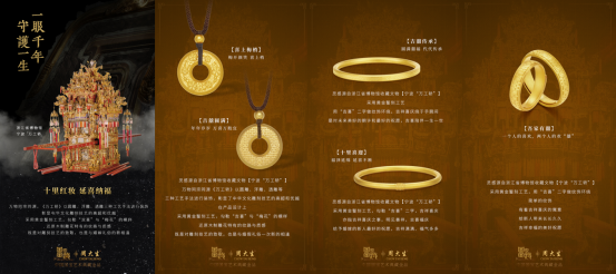 據(jù)中國黃金協(xié)會(huì)統(tǒng)計(jì),2021年全國黃金實(shí)際消費(fèi)量1120.90噸,其中黃金首飾的銷售量高達(dá)711.29噸,較2020年同比增長44.99%,可見,黃金首飾已是我國黃金市場(chǎng)的主力需求,而在此次調(diào)研中,還發(fā)現(xiàn)消費(fèi)者購買黃金首飾的需求中自我剛需和婚嫁禮贈(zèng)的占比最大?;诖粟厔?shì),周大生珠寶與《國家寶藏》將“家慶”系列立意于“頌古傳今,慶一家之喜慶”,博采國寶文化精粹,將烙印在國人心中的千年國寶“三星堆之縱目面具”、“葡萄花鳥紋銀香囊”、“清華海水紋香爐”、“寧波萬工轎”以及“金甌永固杯”等中汲取典型的元素與符號(hào),并采用現(xiàn)代古法工藝和國潮時(shí)尚設(shè)計(jì)融合再創(chuàng),演繹新時(shí)代下的潮金藝術(shù),讓悠久的祝福富有了新時(shí)代的情感內(nèi)涵。