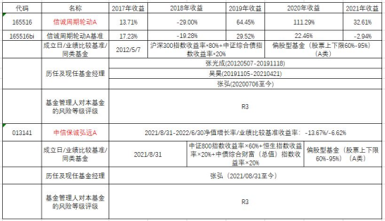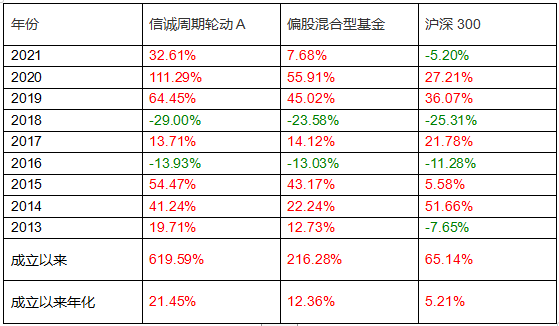 注:1、信誠(chéng)周期輪動(dòng)成立于2012/5/7,自2020/11/21起投資范圍增加存托憑證。成立9個(gè)完整自然年度指2013-2021。其凈值增長(zhǎng)率/業(yè)績(jī)比較基準(zhǔn)增長(zhǎng)率分別為,2013:19.71%/-5.49%,2014:41.24%/42.46%,2015:54.47%/6.99%,2016:-13.93%/-8.39%,2017:13.71%/17.23%,2018:-29.00%/-19.28%,2019:64.45%/29.52%,2020:111.29%/22.46%,2021: 32.61%/-2.94%。