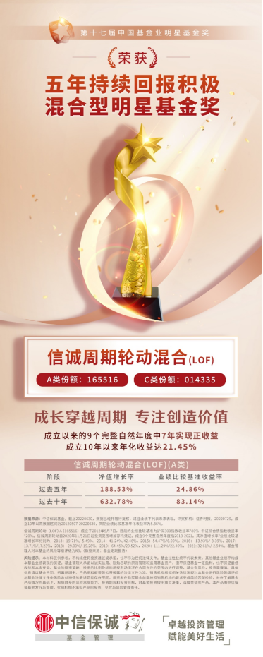 此次獲得五年持續(xù)回報(bào)積極混合型明星基金獎(jiǎng)的信誠(chéng)周期輪動(dòng)混合由中信保誠(chéng)基金經(jīng)理張弘管理。就業(yè)績(jī)而言,截至2022年6月30日,信誠(chéng)周期輪動(dòng)混合(LOF)(A類)近五年收益率188.53%。而拉長(zhǎng)時(shí)間維度來(lái)看,信誠(chéng)周期輪動(dòng)混合(LOF)(A類)近十年收益率實(shí)現(xiàn)632.78%,在成立以來(lái)的9個(gè)完整自然年度中7年實(shí)現(xiàn)正收益1,成立10年以來(lái)年化收益達(dá)到21.45%,其靚麗的業(yè)績(jī)使得此次獲獎(jiǎng)可謂實(shí)至名歸。優(yōu)秀是一種習(xí)慣,信誠(chéng)周期輪動(dòng)混合持續(xù)為投資者創(chuàng)造回報(bào),也得到了諸多評(píng)價(jià)機(jī)構(gòu)的認(rèn)可,2021年7月也在由上海證券報(bào)主辦的第十八屆中國(guó)“金基金”獎(jiǎng)中榮獲“金基金·偏股混合型三年期”獎(jiǎng)。
