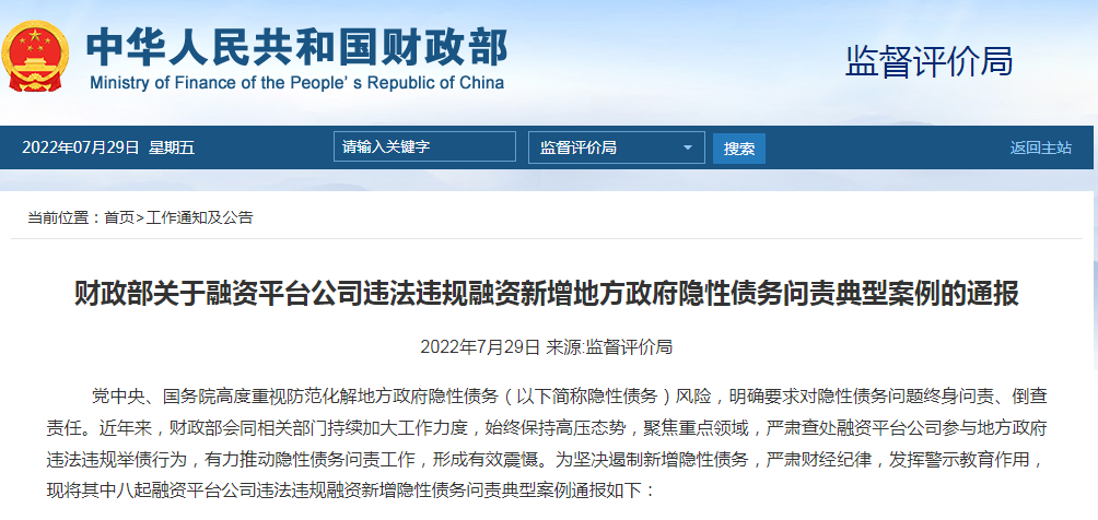 記者7月29日從財政部了解到,為切實嚴肅財經(jīng)紀律,堅決遏制新增地方政府隱性債務,財政部從已完成問責的隱性債務案例中,選取了八起融資平臺公司違法違規(guī)融資新增隱性債務問責典型案例進行公開曝光。