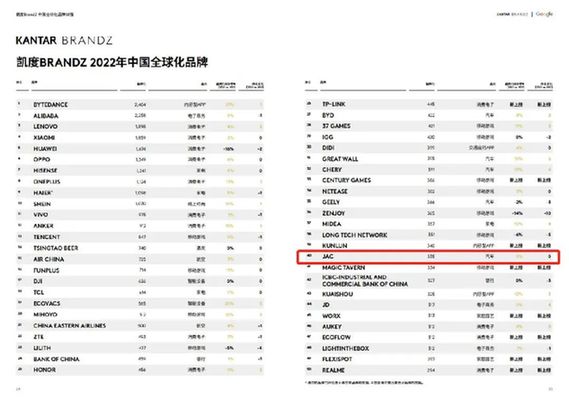 近日,全球知名品牌排行榜凱度BrandZ攜手谷歌發(fā)布了《BrandZ中國全球化品牌》研究報告,揭曉2022年全球化品牌50強(qiáng)及成長明星榜單,江汽集團(tuán)位列中國全球化品牌第40位,中國汽車品牌第5位,品牌力成長率較2021年增長3%。這是繼2021年作為新晉品牌首次上榜之后,江汽集團(tuán)再一次榮登該權(quán)威榜單,展現(xiàn)了持續(xù)、強(qiáng)勁的品牌增長勢頭。