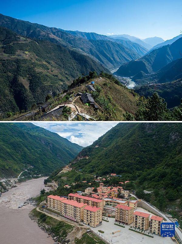 拼版照片:上圖是云南福貢縣匹河鄉(xiāng)托坪村一景(2016年11月25日攝);下圖是搬遷到怒江邊的托坪村五湖易地扶貧搬遷安置點(diǎn)新村(2019年6月25日攝,無人機(jī)照片)。新華社記者 胡超 攝