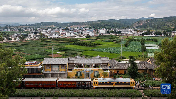游客在云南省建水縣乘坐米軌小火車來到鄉(xiāng)會橋站游覽(2022年7月1日攝,無人機(jī)照片)。新華社記者 胡超 攝