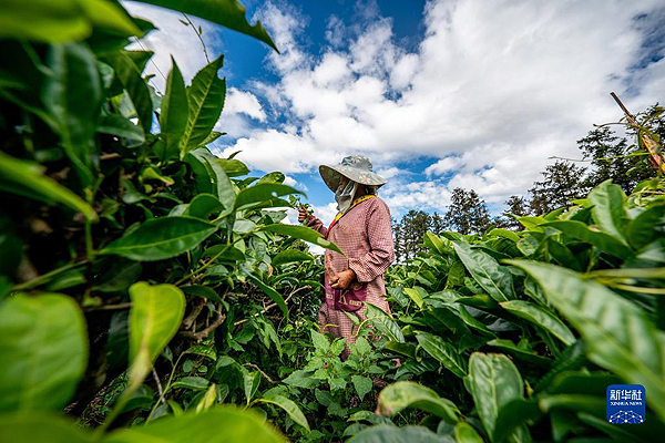 茶農(nóng)在位于云南省西雙版納傣族自治州勐??h的國家種質(zhì)大葉茶樹資源圃采茶(2022年5月10日攝)。新華社記者 江文耀 攝