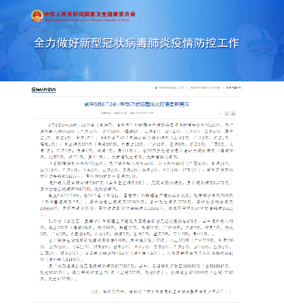 截至8月6日24時(shí),據(jù)31個(gè)?。ㄗ灾螀^(qū)、直轄市)和新疆生產(chǎn)建設(shè)兵團(tuán)報(bào)告,現(xiàn)有確診病例2009例(其中重癥病例2例),累計(jì)治愈出院病例223651例,累計(jì)死亡病例5226例,累計(jì)報(bào)告確診病例230886例,無現(xiàn)有疑似病例。累計(jì)追蹤到密切接觸者4722938人,尚在醫(yī)學(xué)觀察的密切接觸者93522人。