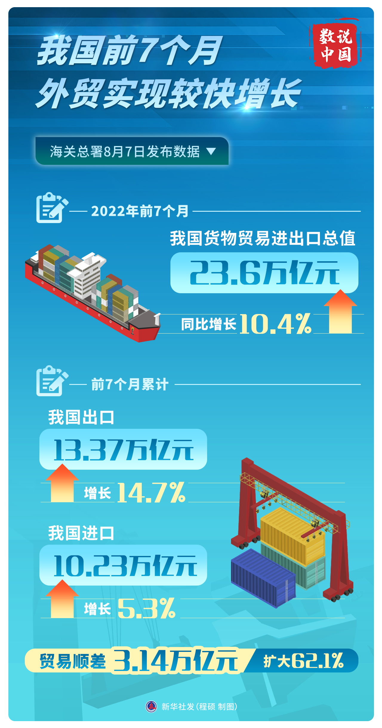 8月7日,海關(guān)總署發(fā)布數(shù)據(jù)顯示,今年前7個(gè)月,我國進(jìn)出口總值23.6萬億元人民幣,比去年同期增長10.4%。其中,7月份進(jìn)出口總值3.81萬億元,同比增速進(jìn)一步提升為16.6%。