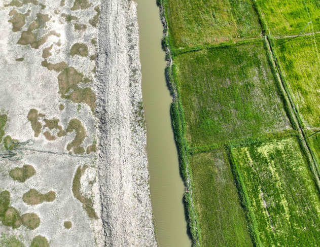 鎮(zhèn)賚縣稻田(右)與鹽堿灘涂一處交界(2022年7月12日攝,無(wú)人機(jī)照片)。潘晟昱 攝