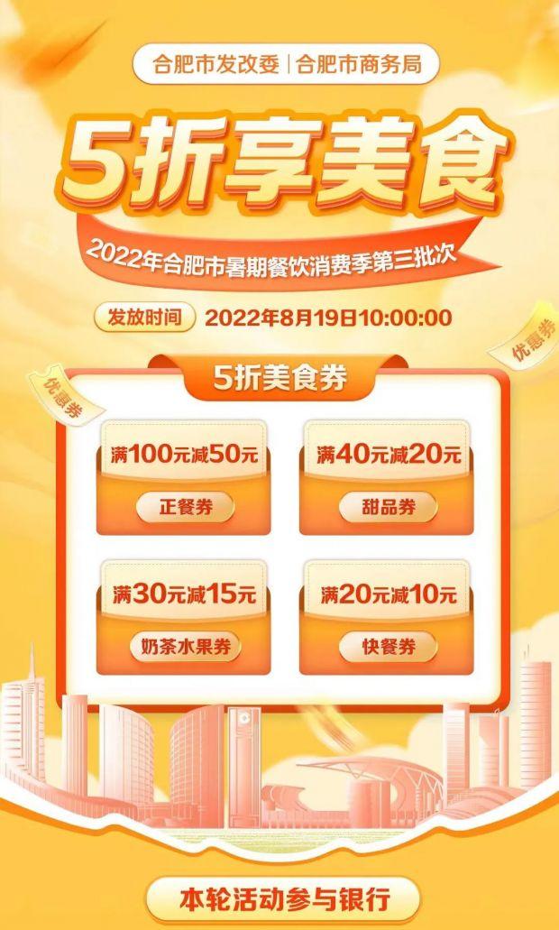 合肥也于8月19日開始發(fā)放暑期消費季第三批消費券,共計1844萬元。據(jù)了解,此次發(fā)放的是餐飲消費券,分為滿100元減50元正餐券、滿40元減20元甜品券、滿30元減15元奶茶水果券和滿20元減10元快餐券,采取電子券形式發(fā)放,消費者可通過登錄多家銀行APP領(lǐng)取。