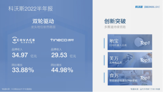 2022年8月26日晚間,科沃斯(603486.SH)發(fā)布2022年半年報(bào)。報(bào)告顯示,作為科沃斯旗下高端智能生活電器新銳品牌TINECO添可,實(shí)現(xiàn)銷(xiāo)售收入29.53億元人民幣,占全部收入的43.28%,較上年同期增長(zhǎng)44.98%。