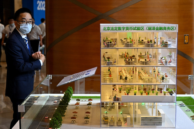 在數(shù)字金融論壇設(shè)置的數(shù)字人民幣體驗(yàn)區(qū),一名與會(huì)者觀看麗澤數(shù)幣一卡通的應(yīng)用場(chǎng)景模型。記者 李鑫 攝