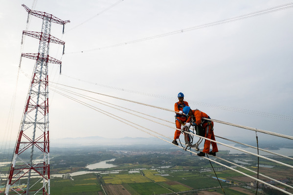 9月18日,在位于湖南省岳陽市臨湘市的南荊長特高壓工程螺山長江大跨越施工現(xiàn)場,國網(wǎng)山東送變電工程有限公司的工作人員調(diào)整間隔棒(無人機照片)。新華社記者 陳思汗 攝