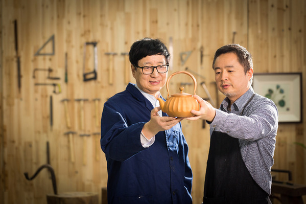 中華老字號“朱府銅藝”傳承人朱炳仁大師和兒子朱軍岷大師在研究銅壺。(受訪者供圖)
