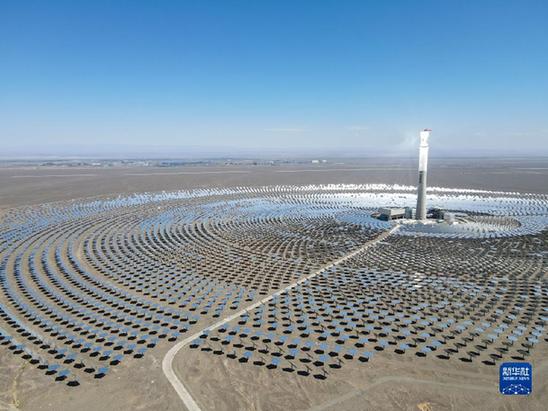 在新疆伊吾縣淖毛湖鎮(zhèn)拍攝的哈密50兆瓦熔鹽塔式光熱發(fā)電站(2021年8月22日攝,無人機(jī)照片)。作為新疆第一座光熱發(fā)電站,哈密50兆瓦熔鹽塔式光熱發(fā)電站不僅污染物零排放,還通過儲存熱能實現(xiàn)24小時持續(xù)發(fā)電。新華社記者 高晗 攝