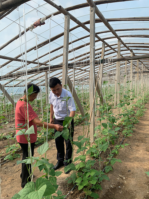 陽谷村行微小一隊(duì)客戶經(jīng)理呂緒陽在孫樓社區(qū)指導(dǎo)黃瓜掐花技術(shù)(資料照片)