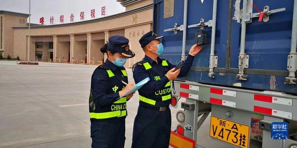 海關(guān)現(xiàn)場關(guān)員在喀什綜合保稅區(qū)登記入?yún)^(qū)車輛電子鎖信息(2022年9月14日攝)。新華社發(fā)(圖爾罕·麥麥提伊敏 攝)
