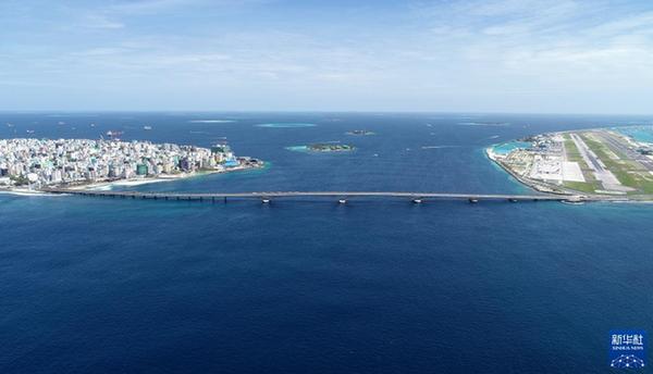 這是馬爾代夫連接首都馬累和機(jī)場(chǎng)島的中馬友誼大橋(2019年8月30日攝,無(wú)人機(jī)照片)。新華社發(fā)(王明亮攝)