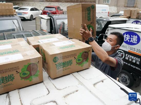 快遞員劉闊在北京市西城區(qū)陶然亭街道一處順豐速運(yùn)營業(yè)點(diǎn)做送貨前的準(zhǔn)備(2022年8月28日攝)。 新華社記者 張晨霖 攝