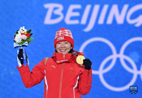 徐夢桃在張家口云頂滑雪公園舉行的北京2022年冬奧會自由式滑雪女子空中技巧決賽奪冠后慶祝(2022年2月14日攝)。新華社記者 吳壯 攝