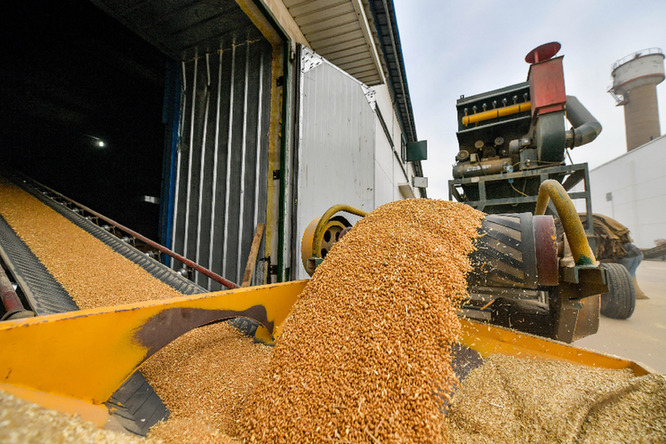 10月12日,在中央儲備糧天津東麗直屬庫有限公司大港分公司,小麥被傳送帶轉運至倉房內。