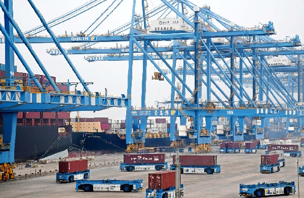 作業(yè)中的山東港口青島港全自動(dòng)化集裝箱碼頭。