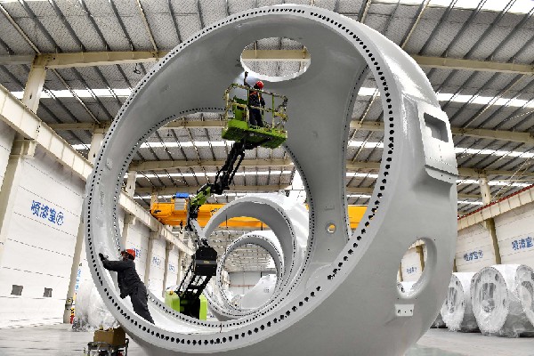 在山東省惠民縣風(fēng)電裝備產(chǎn)業(yè)基地涂裝車(chē)間,工作人員對(duì)風(fēng)電輪轂進(jìn)行涂裝。