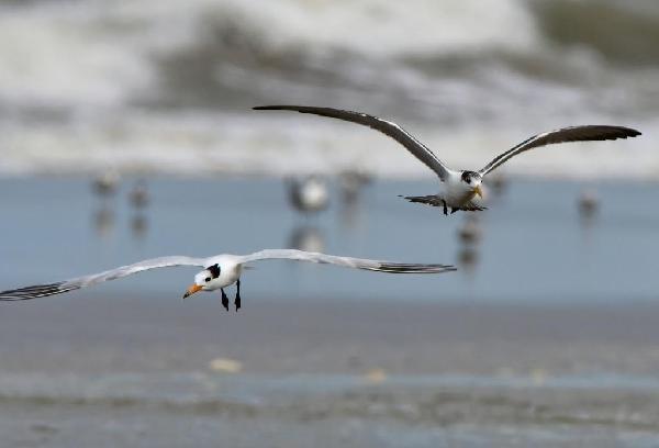中華鳳頭燕鷗(左)和大鳳頭燕鷗在閩江河口國家濕地公園里翱翔覓食。新華社記者 魏培全 攝