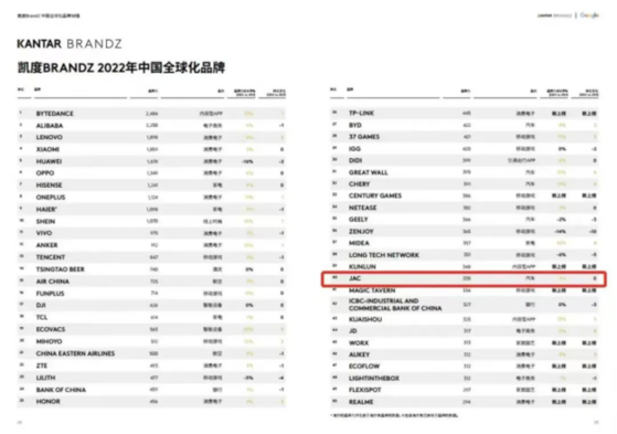 作為最早布局海外市場(chǎng)的中國(guó)汽車品牌之一,江汽集團(tuán)堅(jiān)定“走出去”的步伐,積極響應(yīng)“一帶一路”倡議,加大海外市場(chǎng)開拓力度,進(jìn)一步推動(dòng)公司國(guó)際業(yè)務(wù)持續(xù)向上向好,JAC品牌的世界影響力日益增強(qiáng),底色更亮、成色更足。江汽集團(tuán)位列Brand Z中國(guó)全球化品牌第40位,中國(guó)汽車品牌第5位。