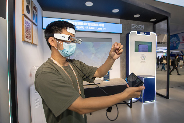 11月10日,觀眾在 “互聯(lián)網(wǎng)之光”博覽會(huì)上體驗(yàn)AR感知交互眼鏡系統(tǒng)。