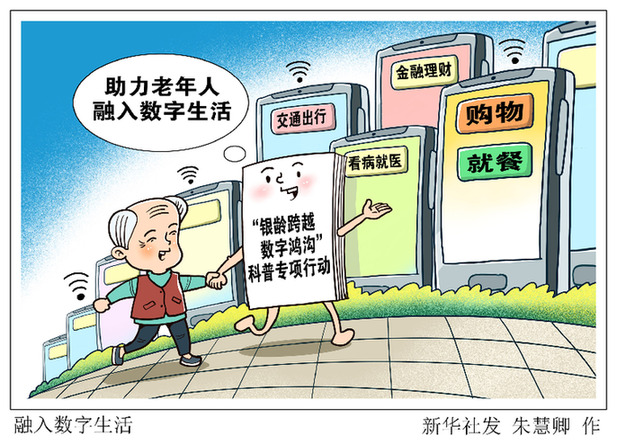 為積極應對人口老齡化,中國科協(xié)、中國銀行、中國聯(lián)通日前聯(lián)合印發(fā)方案,共同開展“銀齡跨越數(shù)字鴻溝”科普專項行動,滿足老年人對信息素養(yǎng)、數(shù)字技能和金融知識等方面的需求,切實解決他們在高頻生活場景中智能應用的現(xiàn)實困難,助力老年人走進數(shù)字時代、享受智慧生活。新華社發(fā) 朱慧卿 作?
