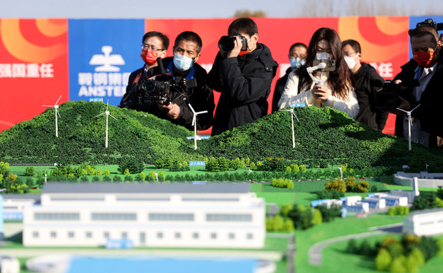 ??? 11月16日,參加鞍鋼西鞍山鐵礦項(xiàng)目開(kāi)工儀式的媒體記者在拍攝鐵礦項(xiàng)目沙盤。新華社記者 姚劍鋒 攝