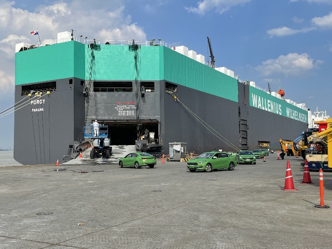 天津華圖汽車物流有限公司一批二手新能源車從連云港裝船發(fā)往阿聯(lián)酋迪拜。(采訪對象供圖)