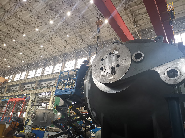 哈電集團(tuán)哈爾濱電機(jī)廠有限責(zé)任公司水電分廠,工人在球閥上作業(yè)。