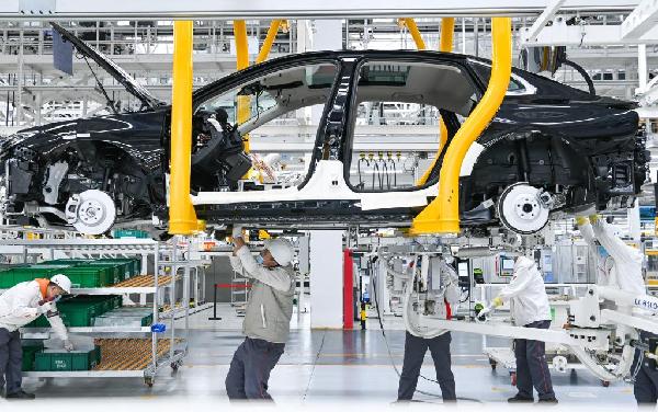 在吉林省長春市中國第一汽車集團(tuán)有限公司紅旗繁榮工廠,工人在總裝車間的生產(chǎn)線上裝配車輛(2022年10月17日攝)。新華社記者 顏麟蘊(yùn) 攝