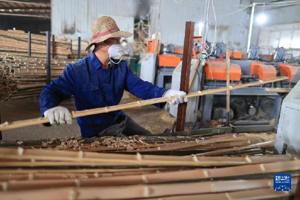 2022年11月30日,工人在貴州新錦竹木制品有限公司內(nèi)生產(chǎn)竹制品。新華社記者 劉續(xù) 攝