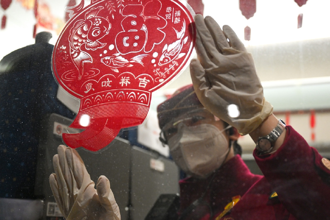 整裝待發(fā)的乘務(wù)人員佩戴手套、口罩、眼鏡的防護“三件套”迎接每一位旅客,列車長還送上了吉祥兔胸針小禮物和溫馨祝福。